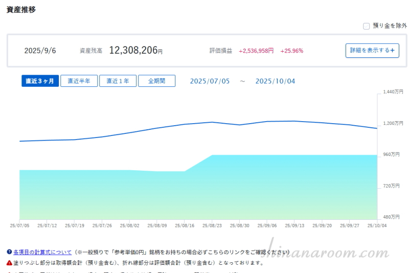 資産推移のグラフを見ると、9月6日時点では約1200万円台の資産となっていました。